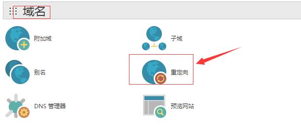 1、首先登录GoDaddy的cpanel面板,找到“域名”的栏目,并在该栏目中找到“重定向”点击进入;