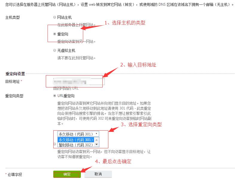 2、进入之后对主机的类型选择“重定向”,在目标地址中填写目标网站的URL,其重定向类型选择301永久移动的,最后点击确定就可以了;